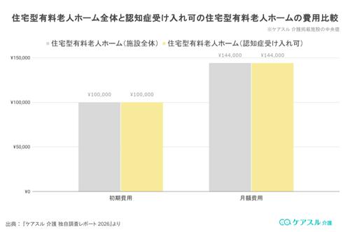 『ケアスル 介護 独自調査レポート 2026』によると、認知症受け入れ可の施設でも初期費用の中央値は100,000円、月額費用の中央値は144,000円と施設全体とまったく同じ金額となっています。