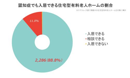 『ケアスル 介護 独自調査レポート 2026』によれば、ケアスル 介護に掲載されている住宅型有料老人ホームで認知症の方を受け入れられる施設は88.8%です。掲載されている住宅型有料老人ホーム2574件のうち2,286件が対応しています。