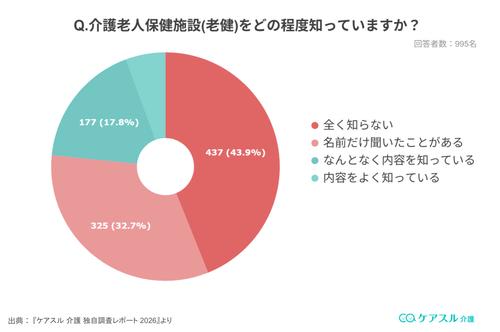 【ケアスル 介護 独自調査レポート 2026】によると、老健について「なんとなく内容を知っている」と回答した人は17.8%ほどにとどまっており、全く知らない(43.9%)、名前だけ聞いたことがある(32.7%)を大きく下回っています。