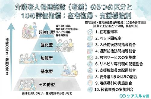 平成30年の介護保険法改正によって、介護老人保健施設(老健)には「基本型」「加算型」「在宅強化型」「超強化型」「その他型」の5つの区分が設けられました。