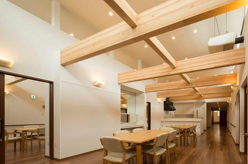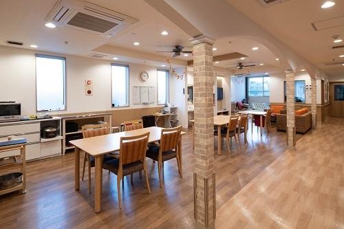 心地よさと機能性を持ち合わせた最新の施設は、南ヨーロッパ風のおしゃれな空間。緑豊かな閑静な住宅街に溶け込む、あたたかみのあるデザインが特徴です。館内は木のぬくもりが感じられる、家庭的で和やかな雰囲気。2階建てのフロアそれぞれにリビングスペースを設置し、リビングスペースを囲うようにご入居者様のお部屋を配置しました。共用のリビングスペースでは、みんなでご飯を食べたりゲームをしたり。和気あいあいとした楽しい時間が流れています。