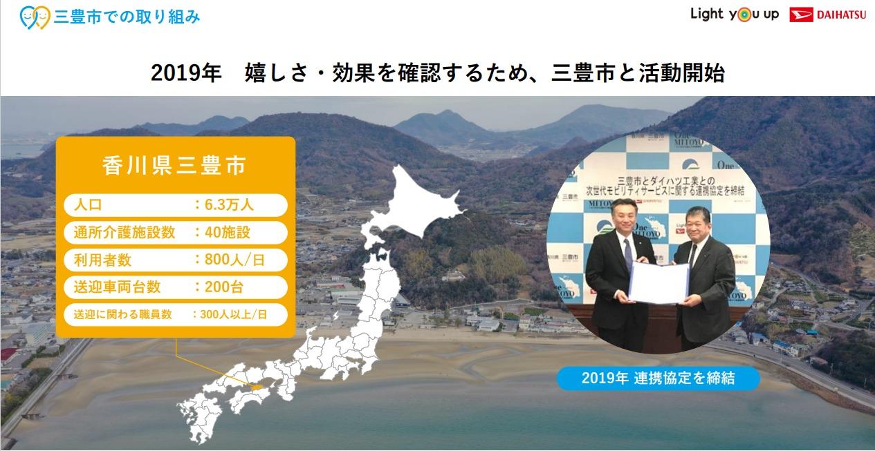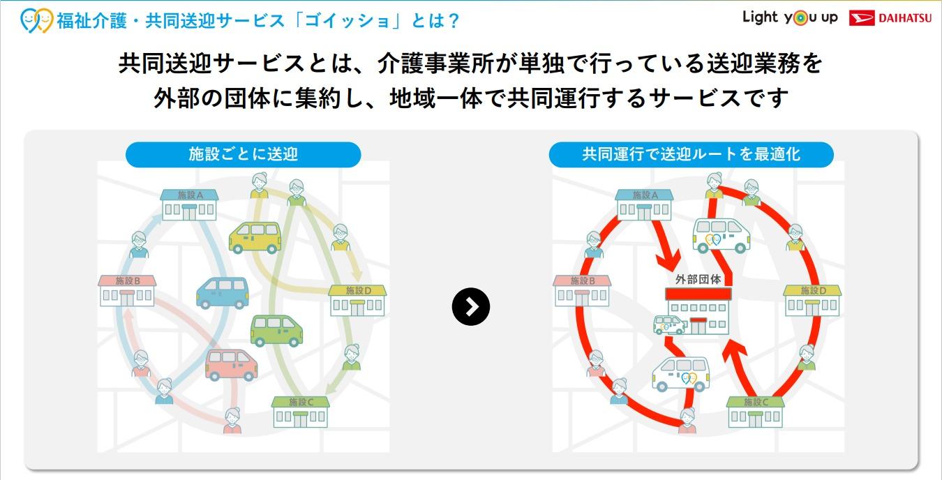 このMaaSの概念を介護・福祉業界に持ち込み、実証実験を成功させているダイハツ工業株式会社の「福祉介護・共同送迎サービス ゴイッショ(以下、ゴイッショ)」というサービスについて、今回はインタビューしてみました。