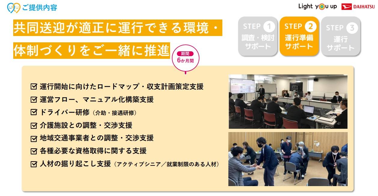また、ここでは各種運行に必要な免許取得もおこなうため、半年くらいの期間がかかります。そして運行準備が終わったのち、実際に運行が始まります。運行開始後は共同送迎運行管理システムを用いながら、日々の運行が効率的になるようにサポートも行います。