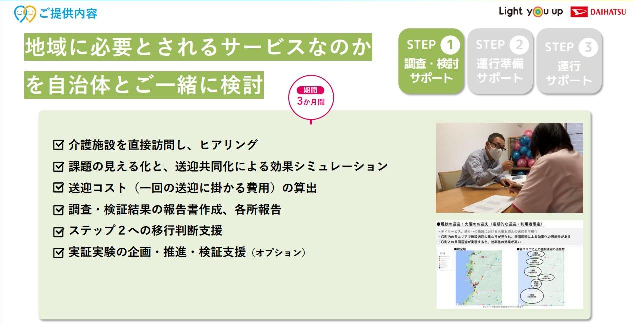 また介護施設への送迎だけでなく、送迎の空き時間を活用して、病院への送迎やスーパーマーケットへのお出かけ、食事のお届けといったこともできるように企画しており、それぞれの地域のニーズに合わせた送迎・移動の提供を試みています。