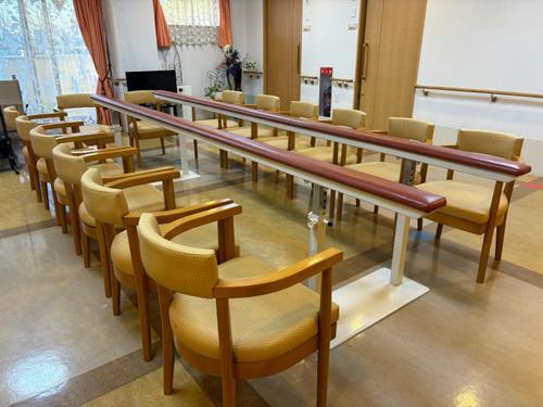 入居者の方には、毎朝9:15に平行棒と椅子のあるフロアに集まってもらい、10:00頃まで体操を行ってもらっています。