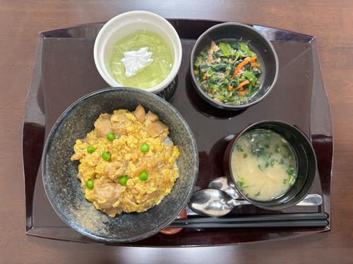 写真は、実際に入居者の方々がお食事をされている様子(写真左)と昼食のメニュー(写真右)です。