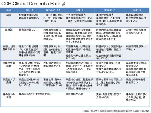 認知症は、認知症とともに生きる人と家族の営む生活に徐々に影響を及ぼす病です。以下の表は日常生活の状態から認知症の重症度を客観的に評価する尺度CDR(Clinical Dementia Rating) です。