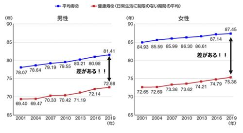 平均寿命は0歳の乳幼児が生存するだろうと考えられる平均年数ですが、この健康寿命は健康上の問題で日常生活が制限されることなく生活できる期間を示しています。現在まで、この平均寿命と健康寿命の差が約10年の差があるため2)、「不健康な期間」が長いということが言えます(図1)。そのため、この「不健康な期間」をいかに短縮できるかが、健康を考えるうえで非常に重要です。