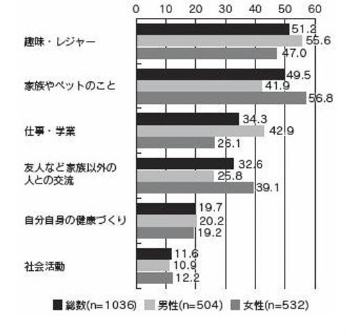 中央調査社が20歳以上の男女2,000人を対象にアンケート調査を実施した「生きがい」に関する世論調査9)では、「生きがいを持っている」と答えた人に具体的な「生きがい」の内容を複数選択してもらいました。その結果、「趣味・レジャー」と回答した者が51.2%と最も多く、次に「家族やペットのこと(一緒に過ごす時間、子どもの成長など)」が49.5%で続きました(図3)。また、「自分自身の健康づくり」の項目を「生きがい」として選んだ者の割合は19.7%、「社会活動」の項目を「生きがい」として選んだ者の割合は11.6%でした(図3)。