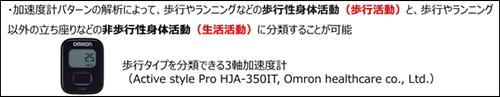 また、この機器では身体活動の種類も分類が可能です。具体的には、大きく歩行活動と生活活動の2種類に分けることが出来ます。歩行活動には通常歩行、速歩、階段昇降などが当てはまり、生活活動にはパソコン作業、家事活動などが当てはまります(表1)。