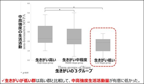 結果として、「生きがい」には「中高強度の生活活動」が関連することが明らかとなりました(図5)。図では、縦軸で中高強度の生活活動量を示しており、横軸で生きがいが高い群、中程度の群、低い群をということを示しています。図の示す通り、一番左の生きがいが高い群と比較して、一番右の生きがいが低い群で、中高強度の生活活動量が低いことが分かります。一方で、「生きがい」には「歩行活動」は全く関連がみられませんでした。