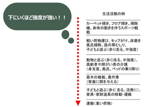 | 生活活動 | パソコン作業 洗濯 食器洗い 小さな荷物の移動 掃除機をかける |