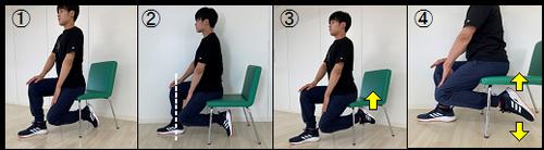 しかし、下肢筋力が低いと、あるいは膝関節への負担を考慮すると、深くしゃがむことは困難であるため、多くの人は「浅くしゃがむ」動作を選択します。よって、前述のケースの場合、大腿四頭筋群は鍛えることができるものの、ハムストリングスはあまり鍛えることができません。マシンを利用したレッグカールは安全性が高く、実施し易いメリットがありますが、どこにでもあるわけではありません。以下にて、椅子に座った状態で実施できるハムストリングスの筋力トレーニングを紹介します(図1)。