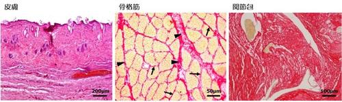 では,一定期間,関節の不動を行うと皮膚や骨格筋,関節包などといった軟部組織にはどのような変化が起こるのでしょうか.この点に関しては,これまで動物実験を通して詳細に調べてきました.その結果,皮膚ではその深層部の皮下組織,骨格筋ではその内部に存在する筋膜(筋周膜や筋内膜という),関節包ではその内層の滑膜に,コラーゲンと呼ばれるタンパク質の著しい増加に伴う線維化と呼ばれる変化が生じることがわかりました(図4).