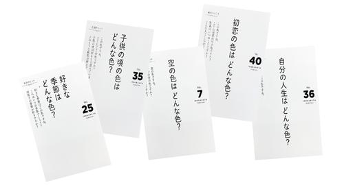 色カルタ・クオリアゲームは認知症高齢者向けに開発された会話を楽しむアクティビティです3)。色カルタは、「好きな季節はどんな色?」や「子供の頃の色はどんな色?」などの色にまつわる読み札(図1)と文字や絵は描かれておらず単色が塗られた色カード(図2)を取り札として使います。読み札を読むリーダー1名と取り札を取る参加者数名で行います。