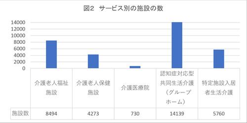 介護サービスを提供する場所は、自宅に住む利用者が利用する居宅事業所、利用者を受け入れる介護保険施設や居住系施設、その他(地域包括支援センター、住宅改修・福祉用具事業所など)があります。居宅事業所には、訪問してサービスを提供する訪問施設、要介護者を日中受け入れる通所施設や数日間受け入れる短期入所施設などがあり、居宅介護支援事業所もケアプラン作成など重要な役割を担っています。一方、介護保険施設は、重度の要介護者を受け入れる介護老人福祉施設(特別養護老人ホーム)、医学管理が必要な重度の要介護者を受け入れる介護老人保健施設や介護医療院であり、居住系施設は有料老人ホームに代表される特定施設やグループホームです。図2はサービス別の介護保険施設数を示しています。認知症高齢者を対象にするグループホームの数は多いことがわかります。