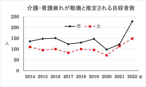 一方、自殺のうち年間200件ほどでは、原因・動機として「介護・看護疲れ」が推定されています(図)。亡くなった人は女性より男性にやや多く、年齢は40代~60代が多くなっています。(2022年に件数が増えたように見えるのは集計方法が変わったためで、それ以前の数字と単純に比較できないので要注意です。)