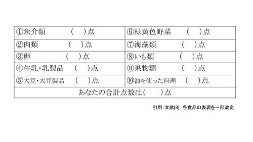 これは、過去1週間、表中の10食品について、「ほぼ毎日食べる」場合に1点とする一方、「2日に1回食べる」、「週に1、2回食べる」、「ほとんど食べない」の場合は0点とし、その合計点を計算します。一般的に、この合計点数が7点以上であれば多様な食品を摂取できていると判定し、7点以下の場合は摂取頻度を改善できる食品について検討することがすすめられます。実際に、多様な食品を摂取している人ほど、筋肉量、握力、身体機能が高いことが知られていますし、認知症の予防にも貢献する可能性が示されています[9]。