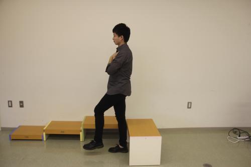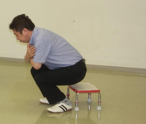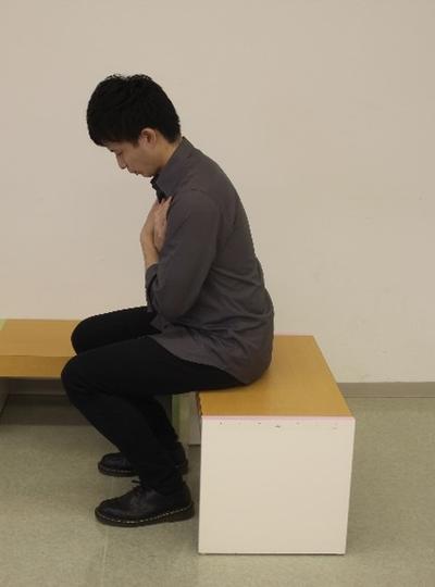 「立ち上がりテスト」では、40cm、30cm、20cm、10cmの4種類の高さが異なる台を準備し、それぞれの台から両脚で立ち上がれるか、さらには片脚で立ち上がれるかを確認します。両脚で立ち上がる場合は、台に腰かけ両腕は胸の前で交差させます。この時、両脚は肩幅くらいに広げ、足部を少し手前に引きます(図1参照)。