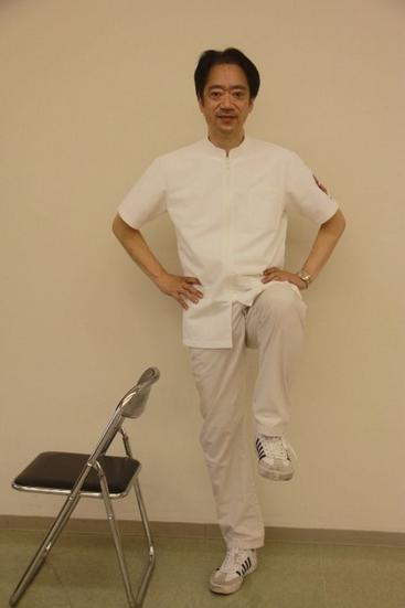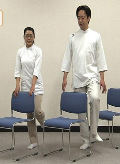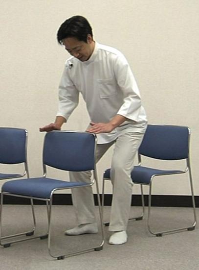 バランスに自信がない人は、机や椅子の背もたれなどに手や指をついて行って下さい。バランスが向上してくれば、次第に手の支えを少なくしてみましょう。踏ん張っている脚の膝関節や股関節に痛みが出る時には無理に行わないで下さい。