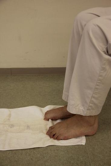 なお、開眼片脚立ち時間は年齢と足指の筋力に関連が認められているので、バランスが悪い人は足指を鍛える運動も行ってみて下さい。最初は、裸足になって足の指で大きくじゃんけんをしてみましょう。指の付け根の関節までしっかり動かして下さい。動きが悪い人は、手で足の指を曲げたり伸ばしたり、開いたりしてほぐしておきましょう。そして、足指でタオルを手前にたぐり寄せる「タオルギャザー」という運動を行ってみましょう(図6参照)。左右3回ずつを1日3セット程度行ってみて下さい。