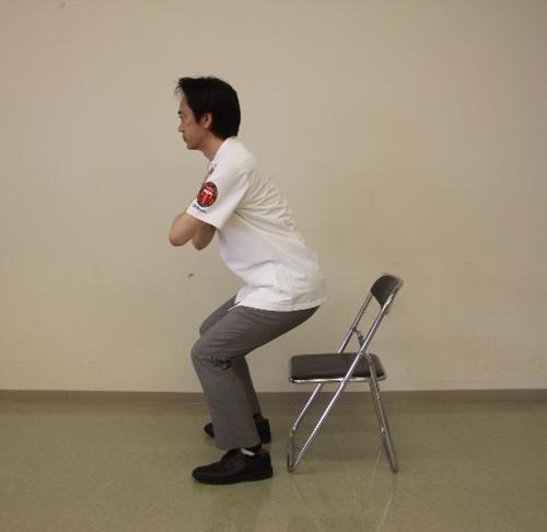 両脚を肩幅程度に広げて立ちます。つま先は少し外側に向けますが、つま先と膝は同じ方向に向けて下さい。両手は胸の前で交差させておきますが、後ろに転倒しそうな人は両手は前に上げておくといいでしょう。その姿勢から目線は前に向けたまま、背中を丸めないようにして、おしりを後ろに引くように、2~3秒間かけてゆっくりと膝を曲げます(図7参照)。そして、ゆっくりと元の姿勢に戻りましょう。
