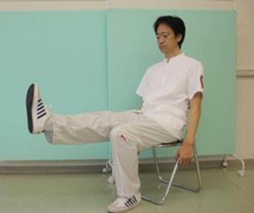 この運動でも難しい場合や膝に痛みが出現する場合は、椅子に腰かけた姿勢から片脚ずつ4秒かけて膝をまっすぐ伸ばし、4秒かけて元の姿勢に戻す運動に切り替えて下さい(図9参照)。この運動では膝に体重をかけないので、膝に痛みを起こすことなく太ももの前の筋肉を鍛えることができます。回数は筋肉が「少しきつい」と感じたら終了です。30回行っても「楽」な場合は、足首に1~2kg程度の重りをつけて行ってもいいでしょう。