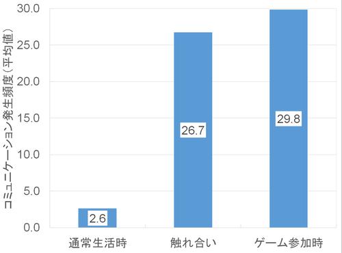 このレクリエーションを,2週間に1回程度の頻度で継続的に実施した介護施設では,無気力・無関心,引きこもり,徘徊,暴言や暴力などの認知症のBPSD(行動・心理症状)の改善に一定の効果がある可能性があることも分かってきました.例えば,通常生活時と比較して,本レクリエーション中のコミュニケーション頻度は10倍程度増えることが分かっています(図3).