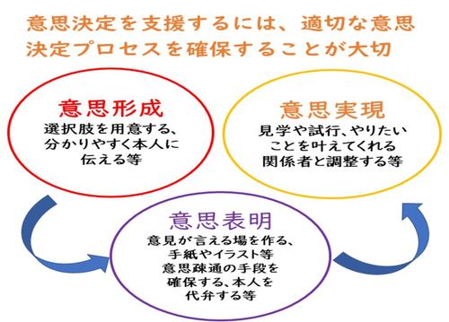厚生労働省が作成した「認知症の人の日常生活・社会生活における 意思決定支援ガイドライン」を見てみると、意思決定を支援するプロセスを3つの段階に分けることができます。(下記の図参照)。まず、自分の意見や意思を持つために必要な情報の提供や説明を本人がわかるように説明を受けるという「意思形成支援」の段階。次に、「こうしたい」という意思を持てたとしても立場上言いづらいとか、話して伝えることが苦手な場合などを想定し、本人が安心して自分の意思を伝えられる機会を作る「意思表明支援」の段階。そして、その希望を可能な限り叶えられるように支援していく「意思実現支援」となります。