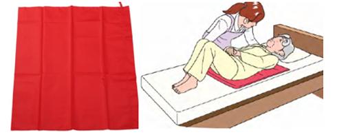 スライディングシートは、滑りやすい布状のもので、これをベッドや布団に寝ている人の下に敷き、位置を移動させたり、体位変換に使用したりします。摩擦を減らすことであまり力を使わずに介助を行うことができます。 |