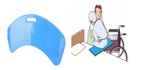 移乗介助時にボードの上を滑らせて移乗するのに使用します。スライディングボードを使用するには、昇降機能のついたベッドと、肘掛け(アームサポート)を外せる車椅子が必要になります。 |