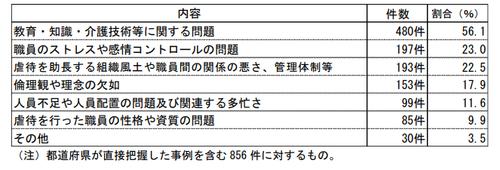 介護現場における虐待の発生要因(表2参照)を見ると、「教育・知識・介護技術等に関する問題」が最も多く、次いで「職員のストレスや感情コントロールの問題」、「虐待を助長する組織風土や職員間の関係の悪さ、管理体制等」、「倫理観や理念の欠如」、「人員不足や人員配置の問題及び関連する多忙さ」、「虐待を行った職員の性格や資質の問題」となっています。虐待が発生する背景として、「専門職としてのスキル」「組織風土や人間関係」「人員不足」といった問題を抱えていることがうかがえます。