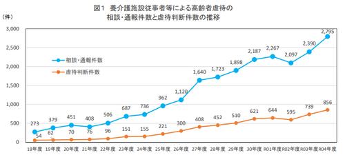 高齢者虐待の状況については、毎年、厚生労働省によって調査結果が公表されています。令和4年度の調査結果2を見ると(図1参照)、養介護施設従事者等による高齢者虐待の相談・通報件数は2795件、虐待判断件数は856件と過去最大の値となりました。これは、高齢化の進展に伴って高齢者の割合が増加していることや、高齢者虐待に関する社会的な認識が高まり、相談や通報の必要性が定着してきていること等が考えられます。なお、令和2年度に数値が一旦減少しているのは、新型コロナウイルスの拡大に伴う面会制限等によって、外部の目が届きにくくなったことが指摘されています。