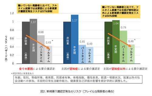 現役世代にとっては働くことは収入を得るということが第一の目的になりますが、近年、就労は高齢者にとって介護予防効果があることも明らかになっています。東京都健康長寿医療センター研究所によれば(Fujiwara et.al., 2023)、フレイルではない元気な高齢者が就労している場合、就労していないひとと比べて、パートタイムであってもフルタイムであっても新規要介護認定が約30%抑制され(図1)、フレイルの高齢者であっても、フルタイムで就労するひとは、就労していないひとと比べて新規要介護認定が57%も抑制されることがわかっています(図2)。