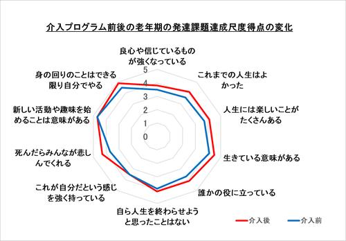 初期認知症の人15人にケアプログラムを実践したところ,全員が何らかの支援があれば,自らの言葉で自らの思いを語ることが可能でした。ケアプログラム実施前後で,日本語版E.H.エリクソン発達課題達成尺度※の得点の変化をみたところ,実施後に得点の上昇を認めました。また,項目別にみると,「これまでの人生はよかった」「誰かの役に立っている」「死んだらみんなが悲しんでくれる」の3項目で得点が統計学的有意に上昇しました(図)。