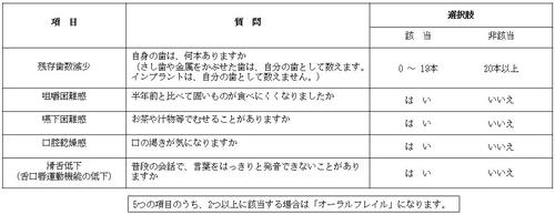 これは特別な機器が必要なく、歯科医療専門職の方がいなくても使用できる5つの質問で、「残存歯数の減少」「咀嚼困難感」「嚥下困難感」「口腔乾燥感」「滑舌低下(舌口唇運動機能の低下)」のうち2 つ以上該当の場合にオーラルフレイルと判断しています(図1,2)。