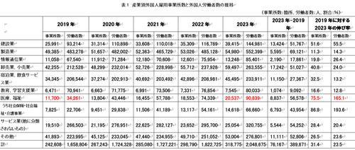 介護サービス労働力不足を解消すべく、近年、この産業では外国人労働者の受入が急速に進展しています。表1では、産業別の外国人雇用事業所数、外国人労働者数の推移を2019年~2023年まで纏めました。