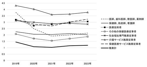 図1では、2019年から2023年までの「医療、福祉」職種別有効求人倍率の推移を示しました。「職業計」の有効求人倍率は「医療、福祉」の7職種すべてと比べて一貫して低く、「医療、福祉」の労働力不足は他産業以上に深刻です。中でも「介護サービス職業従事者」の有効求人倍率は「医療、福祉」の中でも一貫して高く、2023年時点で3.78を示しています。