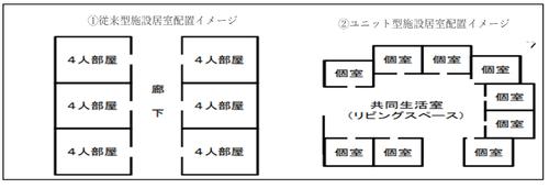 また、全室個室のユニットケアを導入している施設のことを、ユニット型施設という。