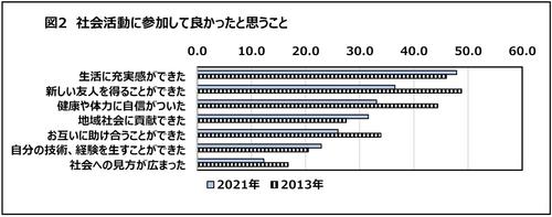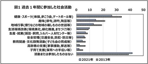 内閣府による高齢者の日常生活・地域社会への参加に関する調査結果をみると、2021年の調査時は、コロナウィルスの感染拡大により人との接触に制限があったため、2013年の調査結果と比較して、「過去1年以内に活動または参加したものはない」と回答した人は2.7ポイント増加しました。