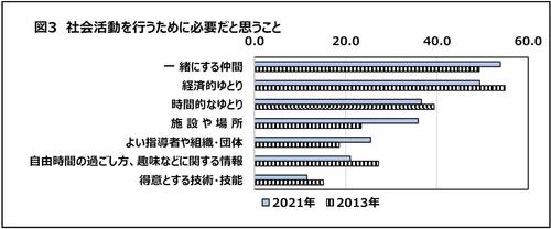 一方、「活動または参加したものがある」と回答した人は「生活に充実感ができた」と回答していました。さらに、「社会活動を行うために必要だと思うこと」について質問すると、「一緒にいる仲間」と「経済的ゆとり」は5割以上の人が必要だと回答していました。