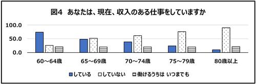 「あなたは、現在、収入のある仕事をしていますか」という質問に対して、加齢とともに「していない」と回答した人が増加しています。一方、すべての年代で2割の人が「働けるうちは いつまでも」と回答していました。欧米諸国と比較して働くことを希望する人が多いのが日本の特徴です。