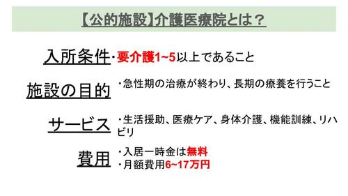 介護医療院のサービス内容としては、医療・看護ケアが中心となっており終身に渡って利用することが出来るのが特徴となっています。