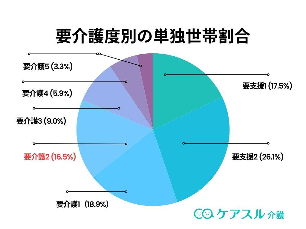 2022年の国民生活基礎調査のデータによると、要介護2の認定を受けており、かつ、単独世帯である人の割合は、16.5%となっています。