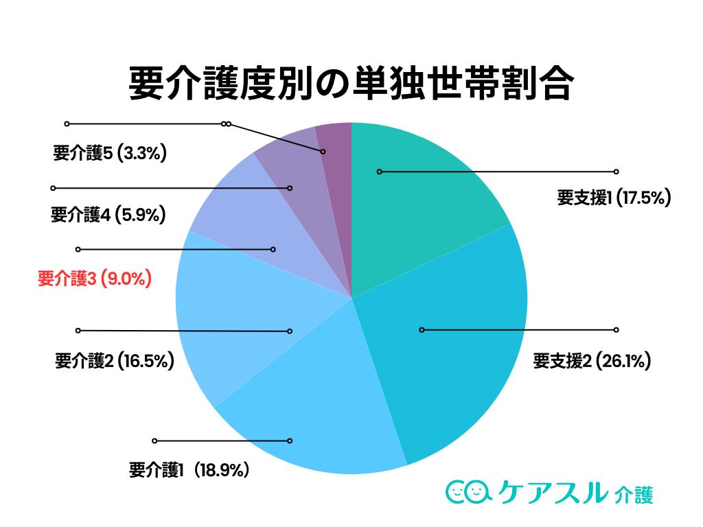 2022年の国民生活基礎調査のデータによると、要介護度別に単独世帯の割合を見た時に、「要介護3」の認定を受けている方は、全体のわずか9.0%となっています。(※単独世帯が必ずしも一人暮らしであるとは限りません)