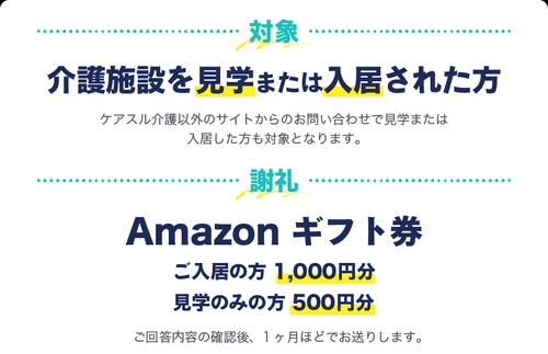 口コミの投稿キャンペーンでは、介護施設を見学又は入居した方限定で、口コミ投稿につきAmazonギフト券をプレゼントするキャンペーンとなっております。